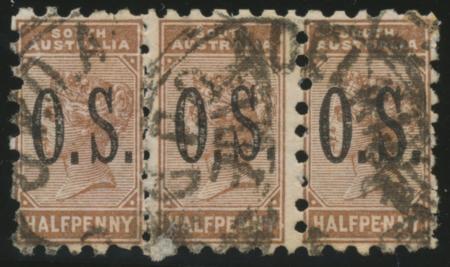 | 1895 ½d Brown, compound perf 10 x 11½, SG 063, rare used strip of 3 |
