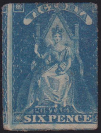 | 1858 6d Bright Blue Queen on Throne, Rouletted 5½-6½, SG 73, MH, variety: long scratch line from throne into shoulder |