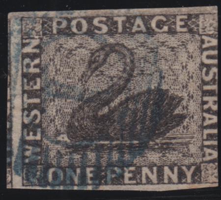 | 1854 1d Black Swan, imperf, 3 margins, SG 1, Blue cancel, used