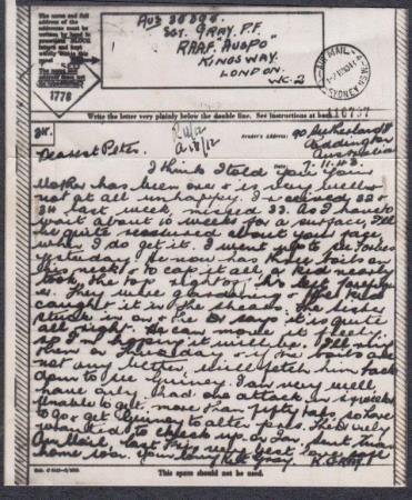| Airgraph No. 117737 dated 7th. November 1943 and Passed By Censor 1776 and addressed to Aus35395 Sgt. Gray P.F. (Peter) R.A.A.F., AUSPO Kingsway London WC2 stamped "4-AIR MAIL-4/1-P-12NO43/SYDNEY NSW" sent by Kit Gray (Wife) of 90 Sutherland St Paddington NSW writing to her husband "I think I told your your mother had been over & is very well and not at all unhappy...I went up to see Forbes yesterday. He has three boils...I am very well, Only had one attack in six weeks .....More.(Adhesive on front & back)