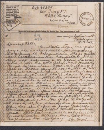 | Airgraph No. 183986 dated 2nd December1943 and Passed By Censor ???? and addressed to Aus35395 Sgt. Gray P.F. (Peter) R.A.A.F., AUSPO Kingsway London WC2 stamped "4-AIR MAIL-4/1-A-3DE41/SYDNEY NSW" sent by Kit Gray (Wife) of 90 Sutherland St Paddington NSW writing to her husband "..Your mother was here yesterday & she is very well. She is moving to 116 Young St Annandale.....the school closes on the 10th so I will have to leave to mind Ian... ..John has sent you a Christmas parcel....More.(Adhesive on front & back photographic spots on back)
