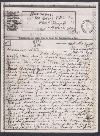 | Airgraph No. 262540 dated 28th December1943 and Passed By Censor 1749 and addressed to Aus35395 Sgt. Gray P.F. (Peter) R.A.A.F., AUSPO Kingsway London WC2 stamped "PADDINGTON/30DE43/NSW" sent by Kit Gray (Wife) of 90 Sutherland St Paddington NSW writing to her husband "Do hope all is well with you have had no word either letter or cable since 14th inst...quiet Christmas....took the kids to Bronte...Gwen, Beth and Jean came.......More.(Adhesive on front & back)