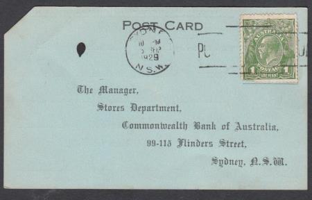 | Pre-printed card in blue addressed to The Manager, Stores Department, Commonwealth Bank of Australia, 96-115 Flinders Street, Sydney N.S.W. being request for 1000 Pay Envelopes with Company Name and Address No. 6150 with Tattersall`s Club, 157 Elizabeth St., Sydney and signed by Company with notation "WHEN COMPLETED THIS CARD ENTITLES YOU TO A FURTHER 1000 PAY ENVELOPES WITHOUT CHARGE" with 1d Green KGV Stamp Die I (corner damage) cancelled "SYDNEY/10 PM/5 SEP/1929/NSW" and partial slogan "PO(ST EARLY IN THE) DA(Y)".