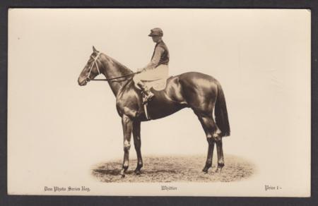 Australia horse racing photo postcard Whittier 1922 &1925 Caulfield Cup winner. Printed in the late 1920s and sold for a 1/-. White mark approximately 2.5 cm from the back of the jockeys head. In 1922 Whittier, owned by Chaffey, ran second in the Caulfield Guineas, and he followed that performance by winning the Caulfield Cup a week later. Whittier repeated his Caulfied Cup victory in 1925, and Manfred was successful in 1926. Whittier and Manfred were Victoria Derby winners in 1922 and 1925 respectively.