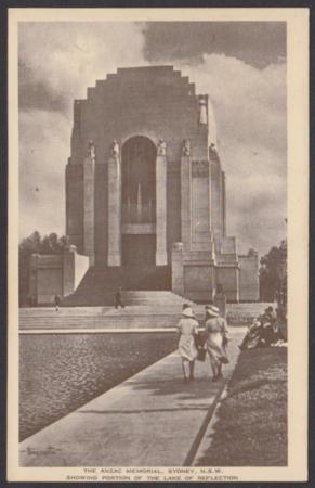 The Anzac Memorial, Sydney, postcard published by the Limbless Soldiers Association, NSW, showing part of the lake of reflection.