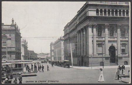 McWhirter & Son postcard featuring a view of Queen and Creek Streets, Brisbane, note tram at left.