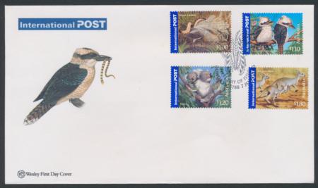 07-Jun-2005 Australian Bush Wildlife International Post Wesley First Day Cover with cachet of Kookaburra, stamps depict Lyrebird, Kookaburra, Koala and Red Kangaroo tied Olinda pictorial postmark