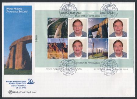 21-Apr-2005 Australia Pacific Explorer Stamp World Expo Wesley Souvenir Cover with cachet of Stonehenge, stamps on sheetlet depict Wet Tropics, Stonehenge, Purnululu National Park and Heart of Neolithic Orkney tied Sydney pictorial postmark