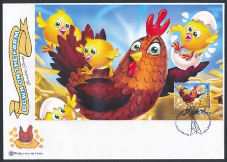 04-Oct-2005 Australia Down on the Farm (Chloe) Prestige booklet pane Wesley First Day Cover with cachet of hen, stamp on miniature sheet depicts Chloe the hen tied New Farm pictorial postmark