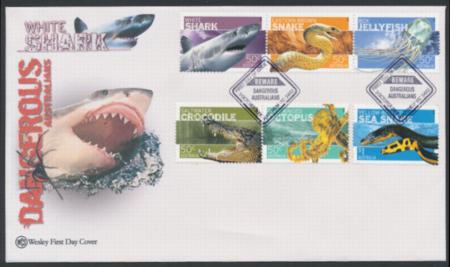| 03-Oct-2006 Dangerous Australians Wesley First Day Cover with cachet of White Shark, stamps depict White Shark, Eastern Brown Snake, Saltwater Crocodile, Box Jellyfish, Blue Ringed Octopus and Wellow Bellied Sea Snake tied Watchem postmark