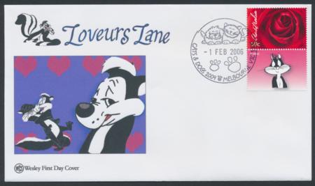 01-Feb-2006 Australia St Valentine's Day Loveurs Lane Wesley Souvenir Cover with cachet of Pepe Le Pew and Penelope Pussycat, PStamp depicts red rose and Pepe Le Pew tied Cats and Dogs Melbourne pictorial postmark