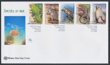 04-Aug-2009 Australia Species at Risk peel and stick Wesley First Day Cover with cachet of Green Turtle, stamps depict Bridled Nailtail Wallaby, Green Parrot, Subantarctic Fur Seal, Blue-tailed Skink and Green Turtle tied Canberra postmark