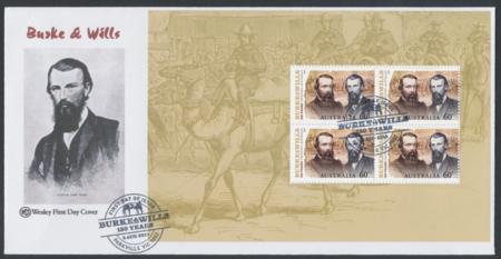 03-Aug-2010 Australia 150th Anniversary Journey of Burke and Wills prestige booklet pane Wesley First Day Cover with cachet of William Wills, stamps depict Burke and Wills tied Parkville pictorial postmark