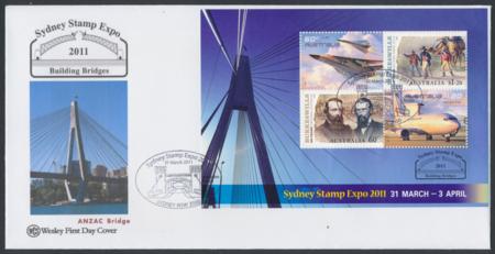 31-Mar-2011 Australia Sydney Stamp Expo Building Bridges miniature sheet Wesley First Day Cover with cachet of Anzac Bridge, stamps depict F-111, Burke and Wills, Burke and Wills returning from Gulf and Wedgetail surveillance plane tied Sydney Stamp Expo pictorial postmark