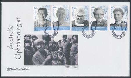 19-Apr-2012 Australia Medical Doctors Wesley First Day Cover with cachet of Dr Fred Hollows, stamps depict Victor Chang, Chris O'Brien, Fred Hollows, Dame Kate Campbell and Jane Stocks Greig tied Healesville stethoscope pictorial postmark