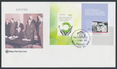 09-Nov-2012 Australia ANZUS miniature sheet Wesley First Day Cover with cachet of ANZUS members signing document, miniature sheet stamps depict Olivia Newton-John Cancer Wellness Centre and ANZUS showing military leaders shaking hands tied Playhouse Theatre Hobart pictorial postmark