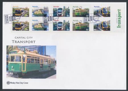 21-Feb-2012 Australia Capital City Transport Wesley First Day Cover self adhesive booklet of 10 with cachet of a Melbourne Tram, stamps depict O-Bahn Bus, Ferry, Train, Tram and Double-Decker Train tied to Ryde, NSW, Pictorial postmark.