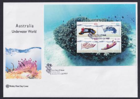 8-May-2012 Australia Underwater World Prestige BKLT Pane Wesley First Day Coverwith cachet of Marine Life scene, stamps depict Godiva Sp, Flabellia rubolineata, Chromodoris westraliensis and Thorunna florens, tied to Mooloolaba, QLD, Pictorial postmark.
