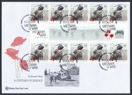 11-Oct-2016 Australia Centenary of Service Vietnam War gutter strip Wesley First Day Cover with cachet of Flanders Poppy and evacuation by helicopter, stamps depict in the field action tied Canberra pictorial postmark