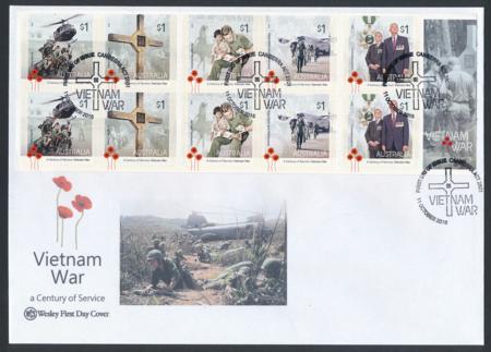 11-Oct-2016 Australia Centenary of Service Vietnam War booklet Wesley First Day Cover with cachet of Flanders Poppy and soldiers "digging in", stamps depict In the Field, Long Tan Cross, Aid & Recreation, Opposition & Withdrawal and Remembering tied Canberra pictorial postmark