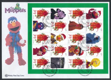 31-Oct-2016 Australia The Muppets mini sheet Wesley Souvenir Cover with cachet of Elmo, stamps depict 65c wrapped gift with Sesame Street characters tied Merrylands pictorial postmark