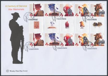 10-Apr-2018 Australia Centenary of Service - War Memorials gutter pairs Wesley First Day Cover with cachet of silhouette of soldier, stamps depict Cobbers Statue, Fromelles, Avenue of Honour, Ballarat, Legacy Memorial, Melbourne, Tomb of Unknown Soldier, Canberra and Cenotaph, Darwin with images in gutter tied Canberra pictorial postmark