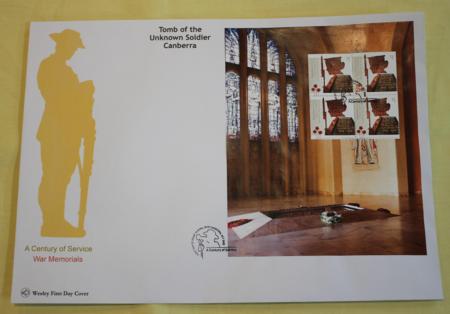 10-Apr-2018 Australia Centenary of Service - War Memorials Prestige booklet pane Wesley First Day Cover with cachet of silhouette of soldier, stamps depict Tomb of the Unknown Soldier, Canberra tied Canberra pictorial postmark
