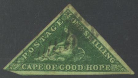| 1858 1s Yellow-Green Imperf Triangle, lower left corner just cut into at an angle otherwise 3 wide margins, SG 8, U |