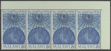 | 1964 2s6d Blue Christmas, top right corner marginal strip of 4, SG 231, MUH. Variety - left stamp flaw left of stamp, 2nd stamp broken 2nd "A" of Malawi
