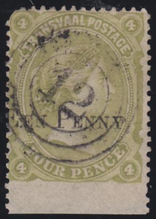 | 1882 1d surcharge on 4d Sage Green Arms, straight base, SG 170, used