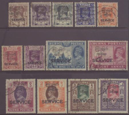 | 1947 Burma Service, set of 13, SG O41-O53 used 8 Anna damaged |