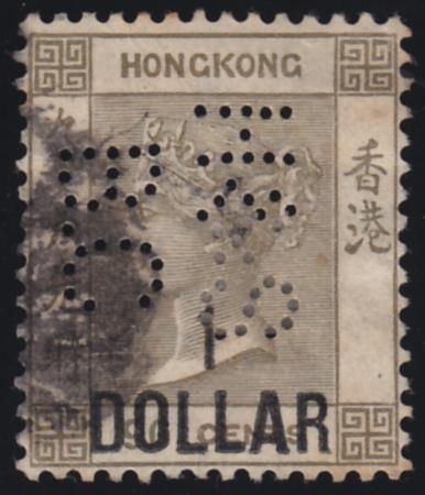 | 1885 Hong Kong $1 Surcharge on 96c Grey Olive, SG 42, used, private perfin H&S / BC |