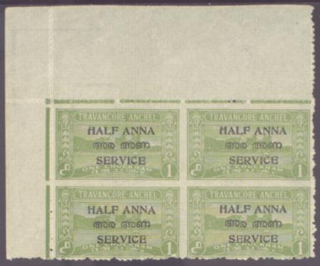 | 1949 ½a on 1ch yellow-green, block of 4, horizontal/vertical imperf, SG 3ee |