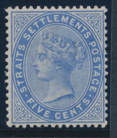 | 1883 Straits Settlements 5c Blue Wmk Crown CA P14 SG 65 MLH