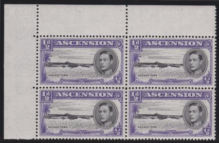 | 1944 Ascension Island ½d Black and Violet, perf 13, SG 38b top corner block of 4, showing doubling of right frame on 2/2 |