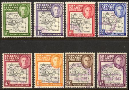 | 1946-9 Falkland Islands Dependencies Thick Map Definintives, set of 8, SG G1-8, CTO