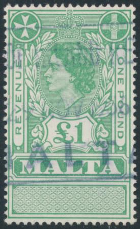 | 1955 £1 green QEII Revenue, perf 14, wmk multi script CA, Barefoot 44 |
