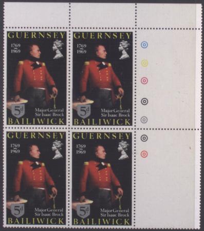 | 1969 5d Sir Isaac Brock, top right corner marginal block of 4, SG 30, MUH. Variety |