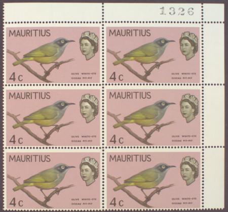 | 1965 4c Definitive, variety: nick in branch R2/5 4th, in cnr marginal block of 6, SG 319v8, MUH