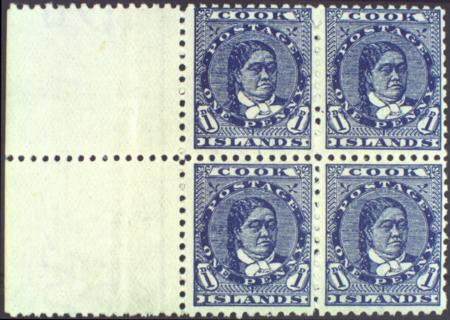 | 1896 Cook Islands 1d Blue, left marginal block of 4, SG 12, MUH