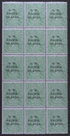 | 1918 ½d Green KGV block of 15, SG 102, plated as 4R34-36,50-60, position 59 and 60 state 2 |