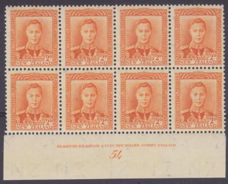 | 1947 2d Orange KGVI, lower marginal block of 8, Plate 54, CP M6a (8), MUH |