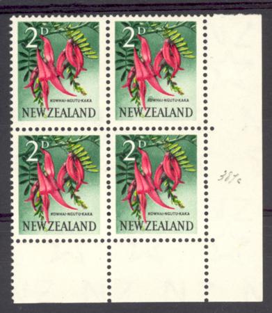 | 2d 1960 Kowhai-Ngutu-Kaka, block of 4, Retouch behind K of Kowhai, CPOV3 - position 19/12 |