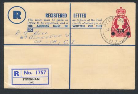 | QEII Registered Postal Stationery. 1/4 on 1s Samuel EF. 11a. SYDENHAM. Used. |