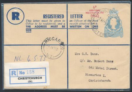 | QEII Registered Postal Stationery. 1/4d plus 6d . Samuel EF. 13a. CHRISTCHURCH.Used.