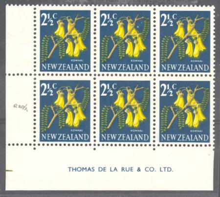 | 2½c Kowhai, Retouch to N of ZEALAND, position 20/2,CPODV4j, Imprint block of 6, SG 848