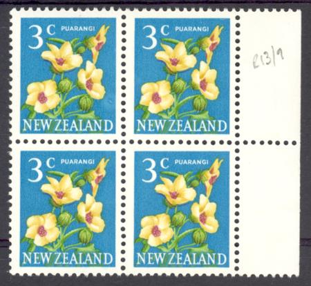 | 3c Paurangi, Retouch above D of ZEALAND 13/9, CPODV5e, block of 4. |