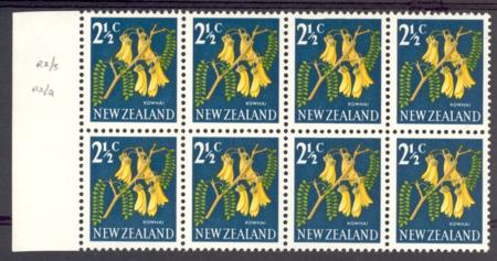 | 2½c Kowhai, Dent and Retouch to top frame 2/3 & 2/4, Plate 2A, CPODV4d(8), block of 8, SG 848
