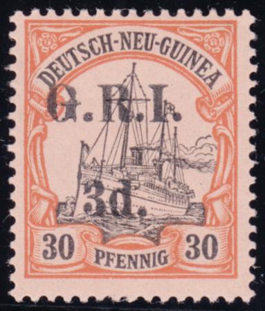 | 1914 New Guinea 3d on 30pf Black & Orange on Buff, overprinted 'G.R.I' , SG 23, MH