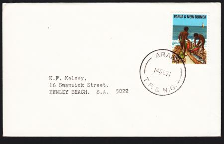 | "ARAWA/14SE71/T.P. & N. G." (North Solomons Province) (First Day Of Postmarker) on 7c Bartering Fish for Vegetables on plain cover to Henley Beach S.A. Postmarker AW-2 used from 14 September 1971 to 30 June 1977. AW-2 Left Bar 11mm Right Bar 10½mm Dot after "T" to Dot after "G" 20mm.